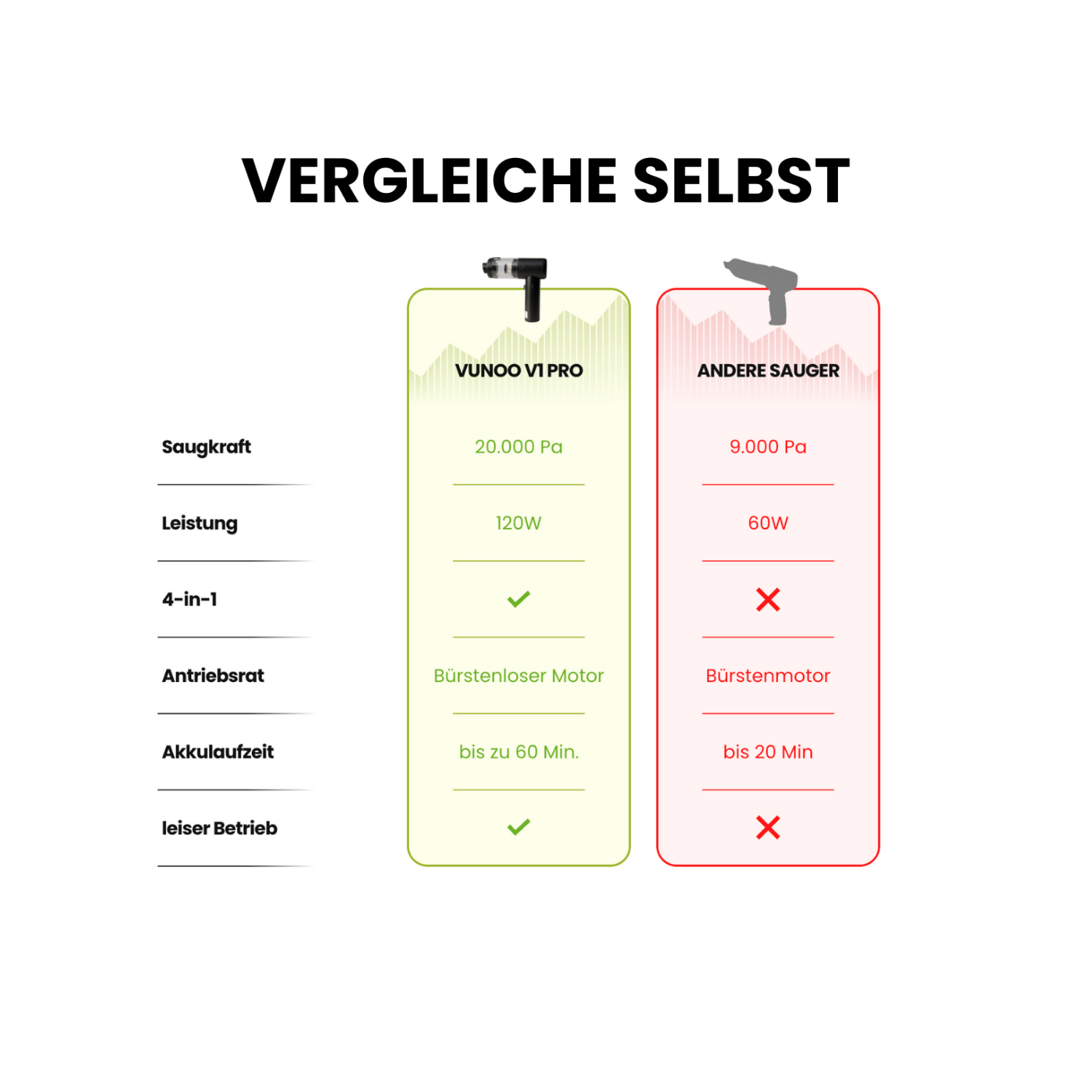Entdecken Sie die Vorteile, die der VUNOO V1 PRO zum Marktführer in seinem Segment machen. Durch seine unangefochtene Saugkraft und vierfache Funktionalität bietet er eine mühelose, zeiteffiziente Lösung für alle Reinigungs- und Alltagsanforderungen.